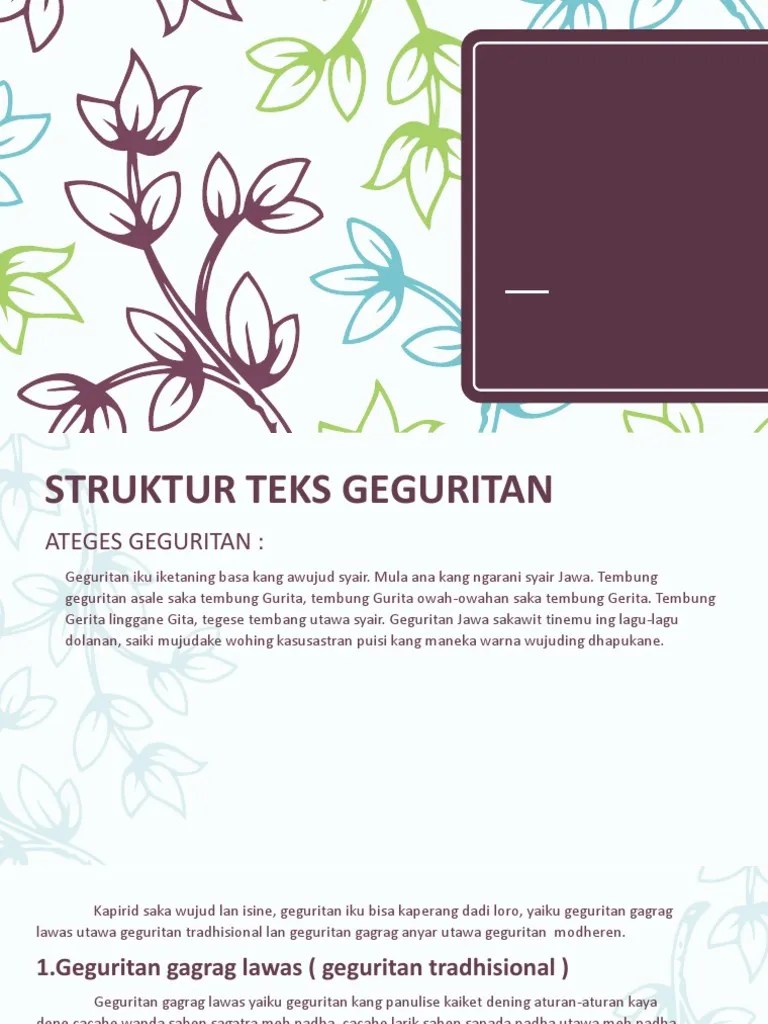 Cacahe wanda saben segatra uga bebas. Cacahing gatra ora ajeg, nanging sithike papat. Mentingake pemilihane tembung kang mentes. Ora nganggo tembung sun gegurit. Geguritan utawa puisi basa jawa ora kaiket dening paugeran tartamtu kayata tembang macapat. Dec 02, 2020 · sejarah geguritan. Tibane swara ing pungkasane runtut. Guritan anyar duwe pathokan : Geguritan yaiku salah sijining sastra jawa kang asale saka rasa ing ati, banjur diungkapake penyair nganggo bahasa kang nduweni irama, rima, mitra, lan tatanan lirik kang nduweni arti/ makna tartamtu. Dene bedhane geguritan kuna lan geguritan modern yaiku: Feb 09, 2018 · diwiwiti tembung sun gegurit. Orang yang membuat geguritan disebut dengan penggurit, penggurit menggunakan sastra bahasa jawa yang tinggi dan bermajas, sehingga bisa membuat orang yang disindir dalam isi geguritan tidak merasa sedang disindir, atau bahkan mereka bisa menembangkan geguritan tersebut. Feb 19, 2021 · geguritan tradisional biasane di wiwiti nganggo tembung a.